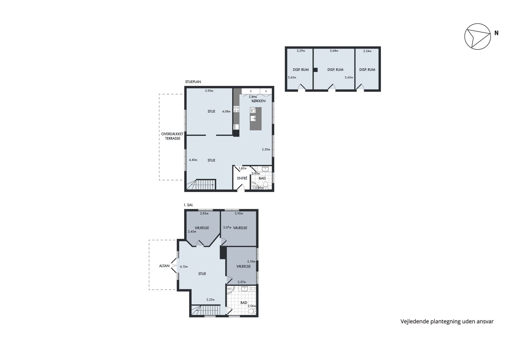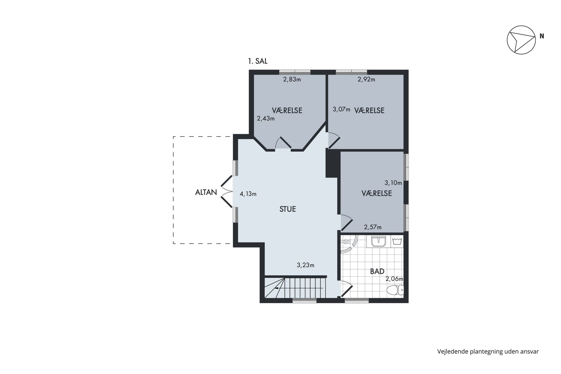 På 1. salen åbner et lyst repos/opholdsrum sig med synlige bjælker og kip – et ekstra opholdsareal perfekt til leg, læsehjørne eller gaming. Heroppe får I tre gode værelser samt endnu et badeværelse med bruseniche og vaskesøjle. Fra repos er der udgang til en dejlig altan, hvor dagens sidste sol kan nydes.