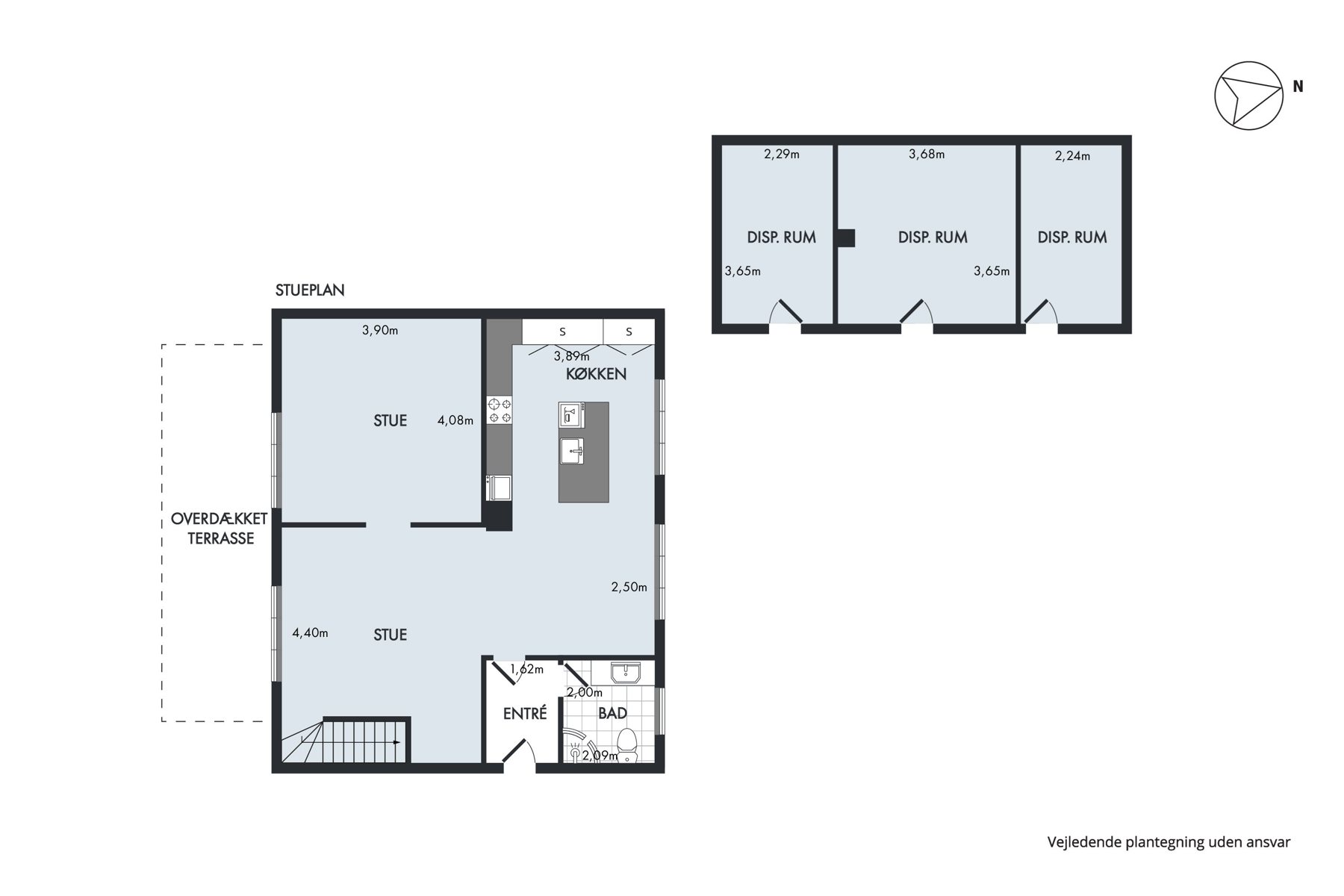 Indenfor mødes I af et lækkert køkken-alrum med køkkenø – hjemmets naturlige samlingspunkt med fin plads til madlavning, lektier og hverdagshygge. I forlængelse ligger to skønne stuer, der kan bruges som spise- og opholdsstue, tv-rum eller hjemmekontor alt efter behov. I stueplan findes desuden et pænt badeværelse samt entré.