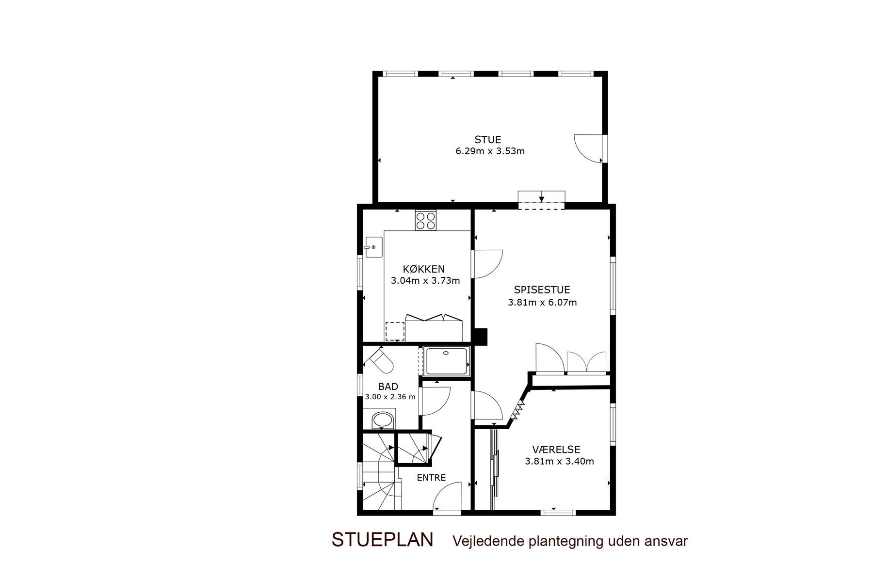 - Stueplan: Husets hjerte samler sig omkring det stilrene, hvide køkken, der ligger i åben forbindelse med en rummelig spisestue og en lys, indbydende stue. Fra stuen er der direkte udgang til terrassen, som smelter inde og ude smukt sammen i sommerhalvåret. Etagen rummer desuden en præsentabel entré, et godt værelse samt et badeværelse, der byder på bruseniche.
