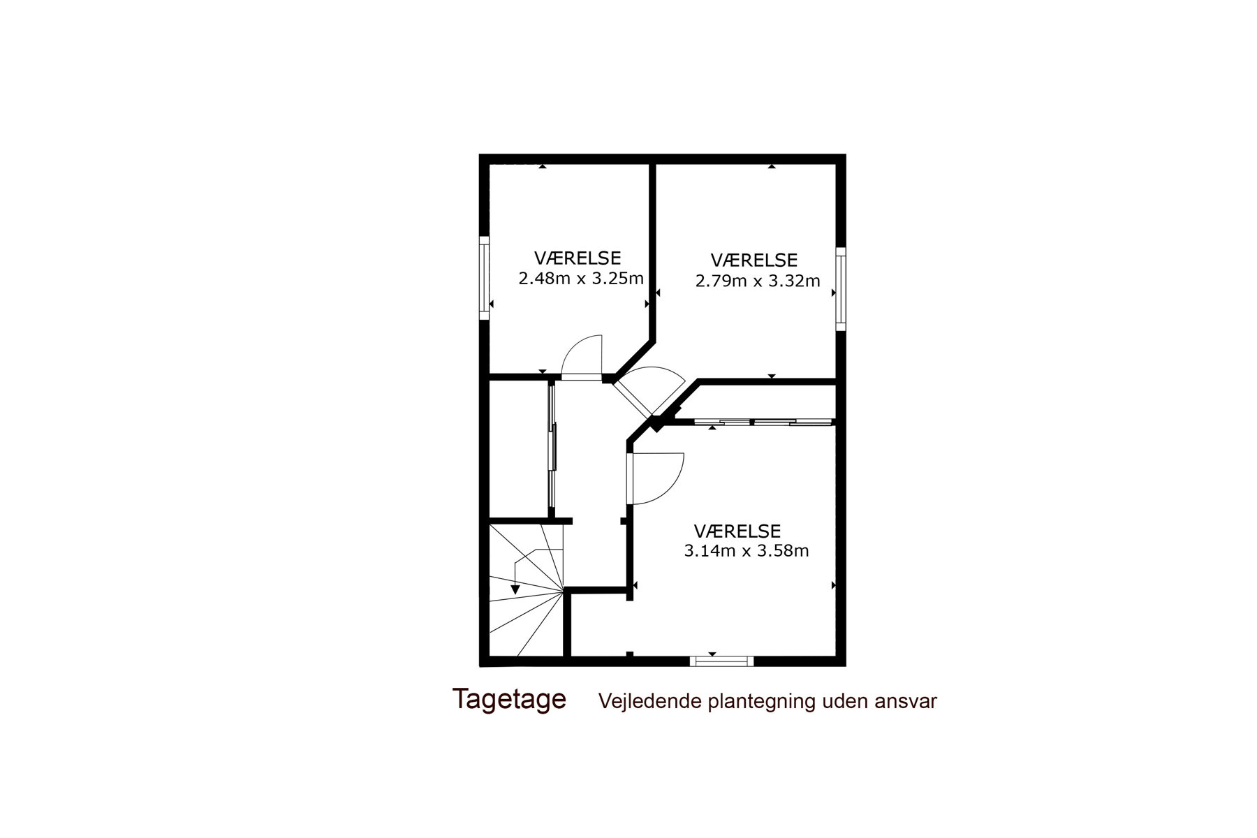 - Tagetage: På førstesalen finder I tre værelser med et dejligt lysindfald og hyggelige skråvægge. To af værelserne er desuden udstyret med en kvist, hvilket giver et skønt lys og ekstra rummelighed under taget.