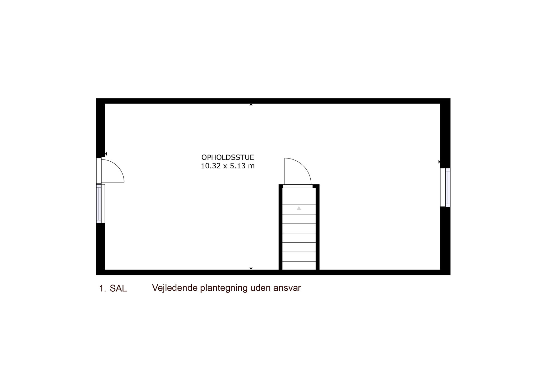 Førstesalen byder på en stor og lys stue, der nemt kan opdeles i flere værelser efter behov – perfekt til børnefamilien eller jer, der ønsker ekstra fleksibilitet.